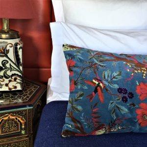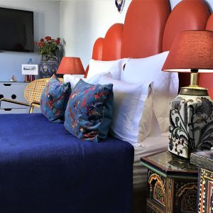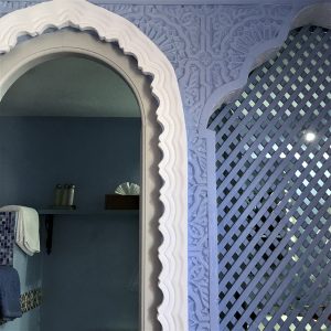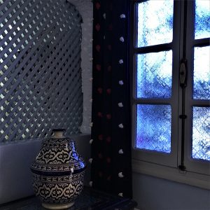 Blue and white bedroom with a dome, decorated with pottery from Fez.
