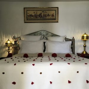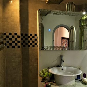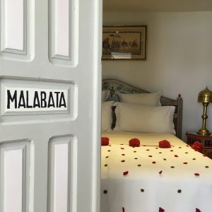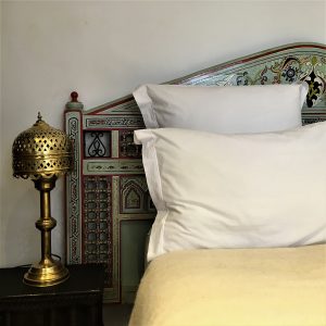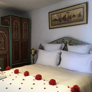 Preciosa habitación con salida a la terraza de la casa dominando los techos de Casbah. Refugio de vegetación en medio de limoneros y naranjos. Muebles pintados. TV, caja fuerte y aire acondicionado. Cama queen size.